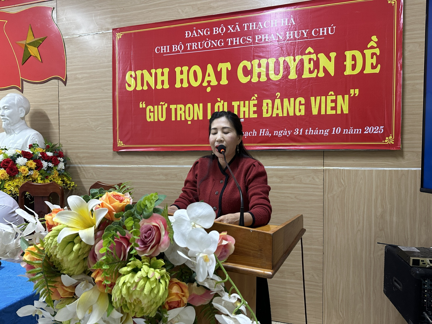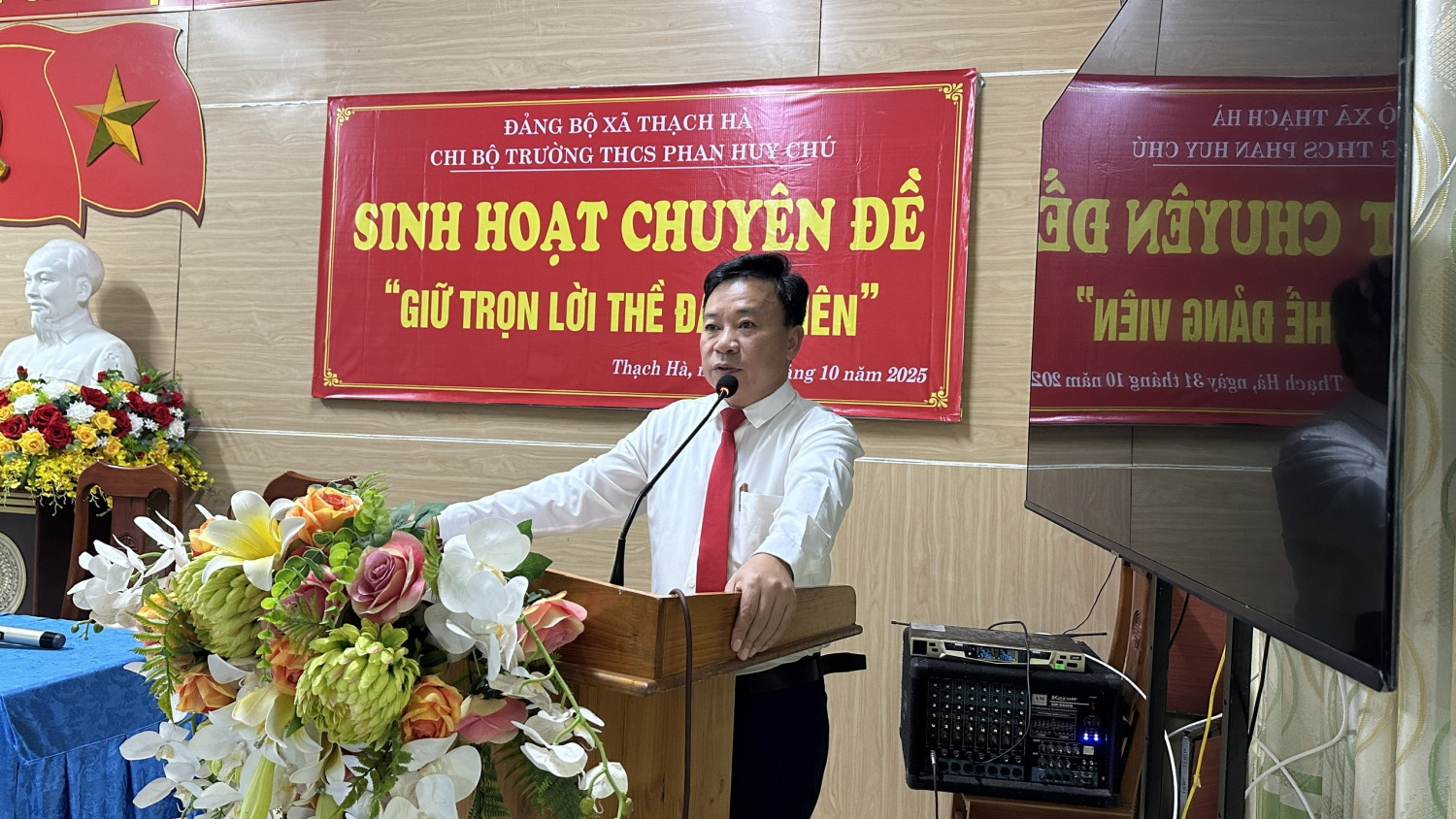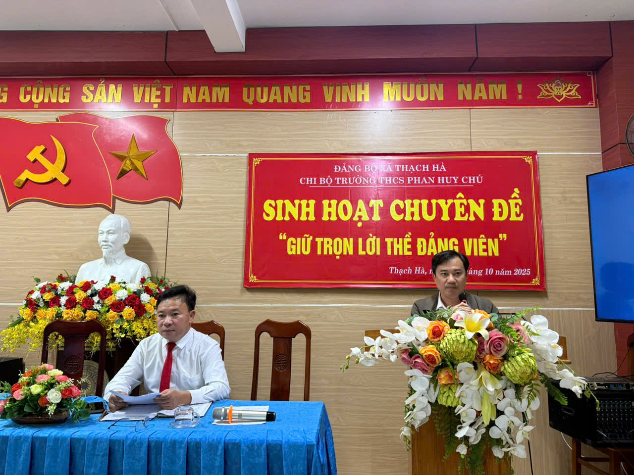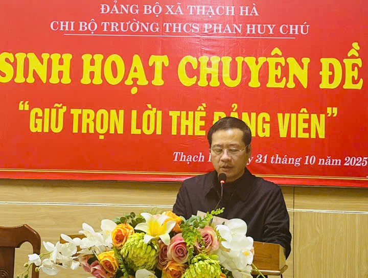 Thực hiện kế hoạch của Đảng ủy xã Thạch Hà về việc tổ chức sinh hoạt chuyên đề năm 2025, chiều ngày 31 tháng 10 năm 2025, Chi bộ Trường THCS Phan Huy Chú đã tổ chức buổi sinh hoạt chuyên đề với chủ đề “Giữ trọn lời thề Đảng viên”.
